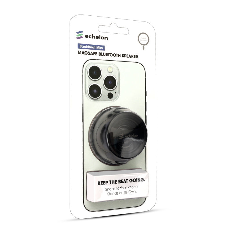 Lock in. Power up. Play anywhere. The echelon BackBeat Mini MagSafe Bluetooth Speaker delivers next-level audio in a compact, RGB-lit design. Engineered for high-performance audio, this compact yet powerful speaker features a 40mm driver and 5W full-range sound, delivering crisp highs, deep bass, and dynamic clarity. A strong MagSafe connection ensures a secure, snap-on fit to your device, keeping the music going without interruption. Whether you’re gaming, streaming, or taking calls, low-latency gaming mode ensures ultra-responsive audio. RGB LED lighting brings every beat to life with a vibrant glow, while Bluetooth 5.3 provides a stable, fast wireless connection. Designed for durability, the IPX5 waterproof rating protects against splashes and spills, making it perfect for on-the-go use. With up to 4 hours of battery life and play-while-charging functionality, the BackBeat Mini MagSafe Bluetooth Speaker delivers immersive sound, anywhere, anytime.