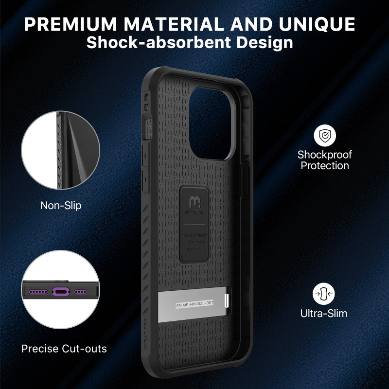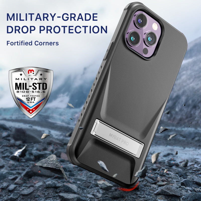 Go beyond ordinary protection. The MyBat Pro Beyonder Series Case for iPhone 14 Pro Max combines style, comfort, and all-around defense in one sleek design. Its hybrid build pairs a durable hard back with padded sides and embedded non-slip grips for a secure, comfortable hold. The integrated metallic kickstand doubles as a magnetic mount plate, making it easy to enjoy hands-free viewing or use with car mounts. For added coverage, the included 9H tempered glass screen protector keeps your iPhone 14 Pro Max safe from scratches and cracks. With raised bezels for screen and camera defense, and an easy snap-on fit, the Beyonder Series goes further to protect your iPhone 14 Pro Max without the bulk.