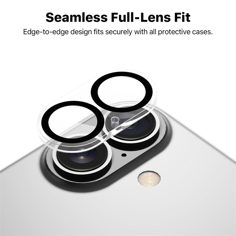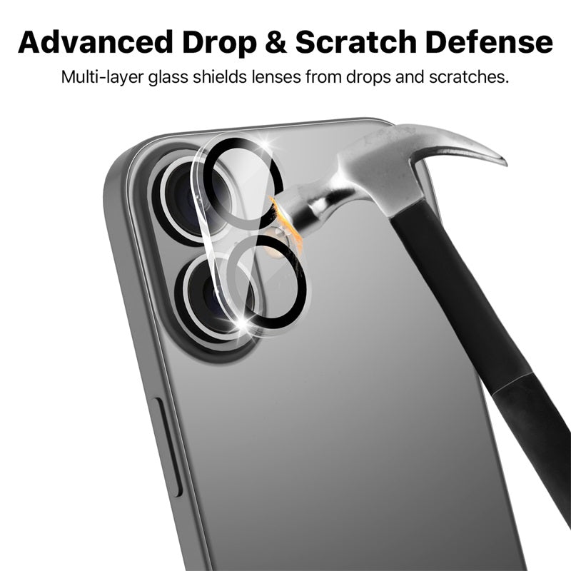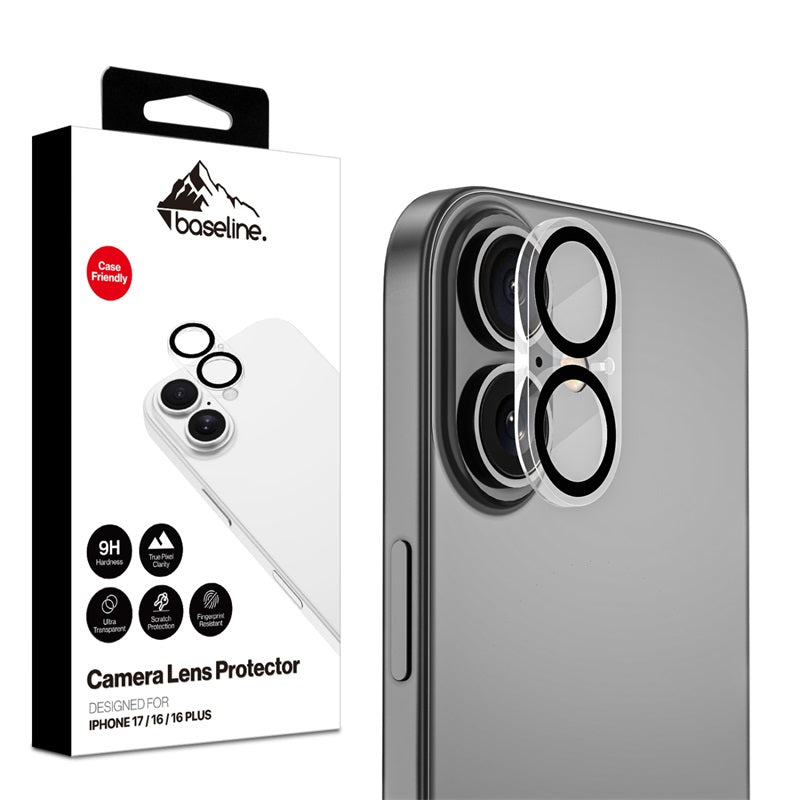 Keep scratches out of the frame. The baseline Tempered Glass Camera Lens Protector for iPhone 17, iPhone 16 Plus, and iPhone 16 is a must-have for protecting your iPhone's camera lens from scratches, cracks, and everyday damage. Designed with 9H hardness and 5X the strength of standard glass, it offers premium durability without compromising photo quality. The ultra-thin profile, 2.5D rounded edges, and high transparency ensure your lens stays safe and sharp with a perfect fit.