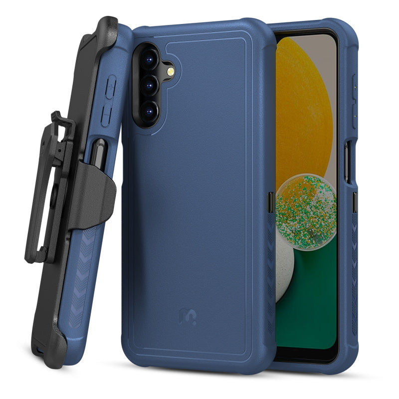 For those who follow their own path. Rugged, reliable, and ready for anything, the Maverick Series Case for Samsung Galaxy A13 5G is built for bold protection and independent spirit. This triple-layer case pairs military-grade toughness with everyday functionality, featuring shock-absorbing corners, a reinforced camera ring, and raised bezels to shield your Galaxy A13 5G screen and lenses. A textured, non-slip grip keeps it secure in your hand, while the included rotating holster doubles as a kickstand for hands-free use. Whether on the job, at the gym, or out on the trail, the Maverick Series has you covered.